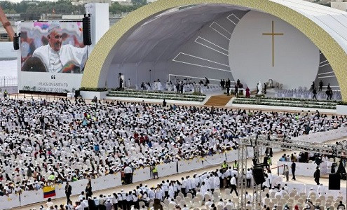 As Francis was driven on a open popemobile through the crowd on the stadium’s pitch just before the start of the Mass, a speaker on the altar platform shouted “God bless the pope, God bless the royal family.”