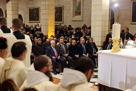 President Mahmoud Abbas attended the Christmas Eve Midnight Mass last night in the Church of Saint Catherine adjacent to the Church of the Nativity in Bethlehem, celebrated by the Roman Catholic Christian denominations in Palestine.