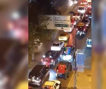 The video below, filmed from a nearby building, shows a group of vehicles blocking the street, hazard lights flashing and honking erratically. The cars are draped with Azeri and Turkish flags. The scene took place on Halaskargazi Avenue, one of Istanbul’s main roads.